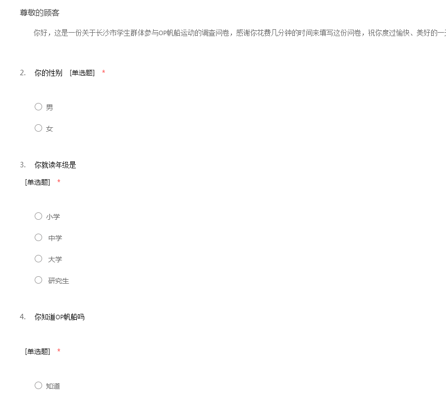 你好,这是一份关于长沙市学生群体参与OP帆船运动的调查问卷,感谢你花费几分钟的时间来填写这份问卷,祝你度过愉快、美好的一天!
