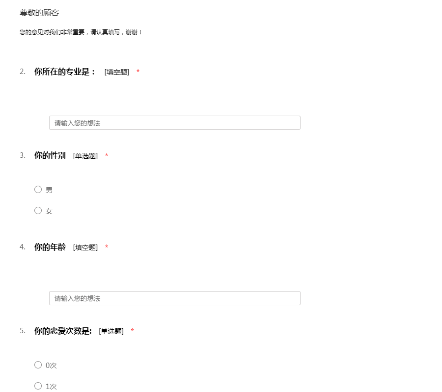 本次问卷调查意在了解当代大学生的恋爱实际情况,您的真实回答对我们来说十分宝贵!感谢您在百忙之中回答此卷!51调查网(我要调查网)谢谢您的参与。