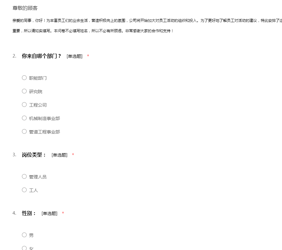 亲爱的同事,你好!为丰富员工们的业余生活,营造积极向上的氛围,公司将开始加大对员工活动的组织和投入。为了更好地了解员工对活动的建议,特此安排了这次的员工活动问卷调查表。你的建议对我们非常重要,所以请如实填写。本问卷不必填写姓名,所以不必有所顾虑。非常感谢大家的合作和支持!