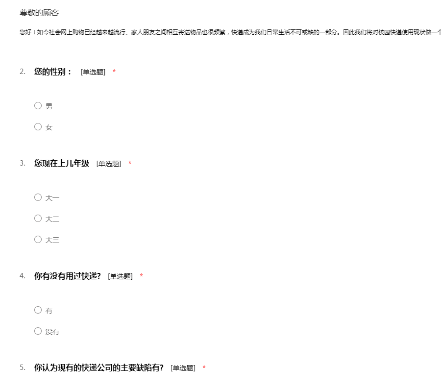 您好!如今社会网上购物已经越来越流行、家人朋友之间相互寄送物品也很频繁,快递成为我们日常生活不可或缺的一部分。因此我们将对校园快递使用现状做一个调查,希望您帮助我们填写此份问卷。谢谢!