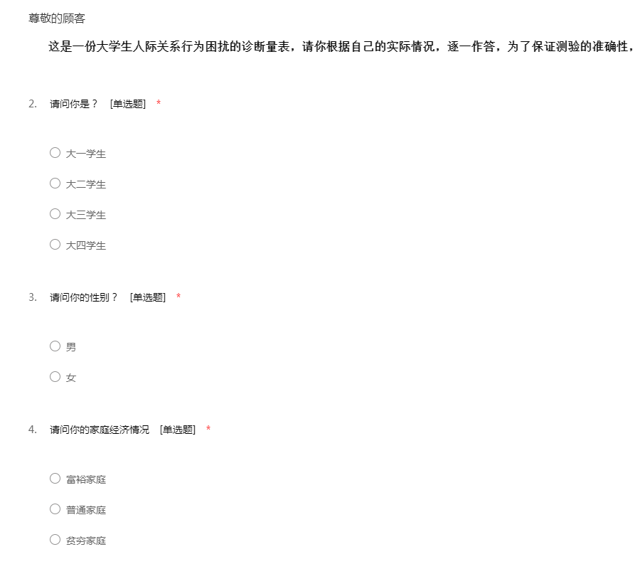这是一份大学生人际关系行为困扰的诊断量表,请你根据自己的实际情况,逐一作答,为了保证测验的准确性,请你认真作答。