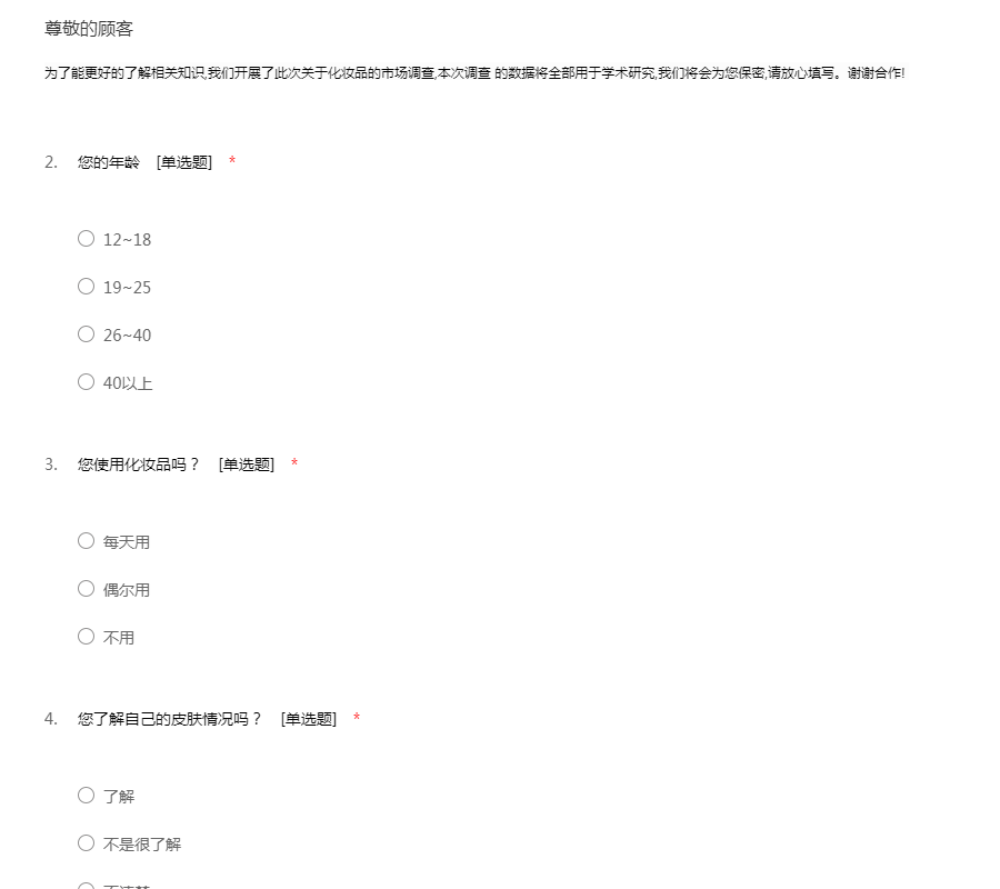 为了能更好的了解相关知识,我们开展了此次关于化妆品的市场调查,本次调查 的数据将全部用于学术研究,我们将会为您保密,请放心填写。谢谢合作!
