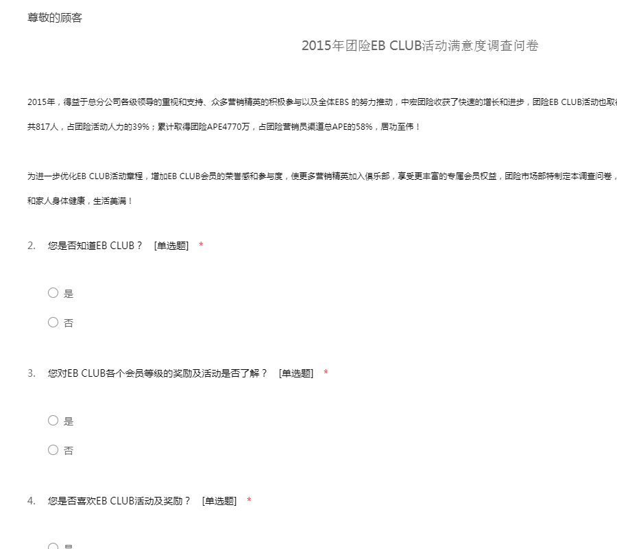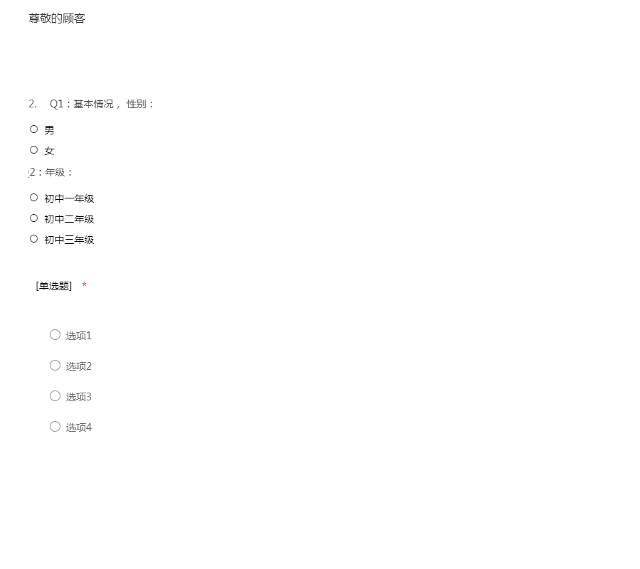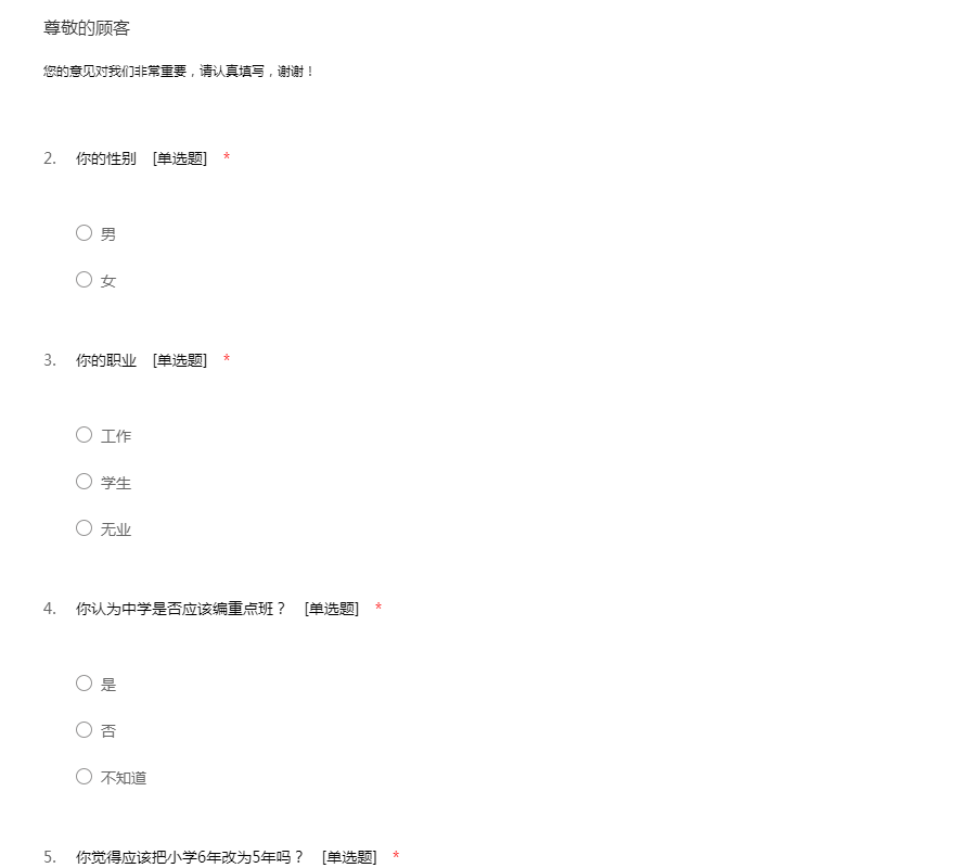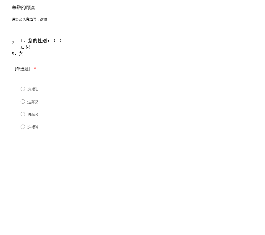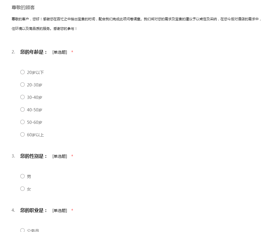 尊敬的客户,您好!感谢您在百忙之中抽出宝贵的时间,配合我们完成此项问卷调查。我们将对您的需求及宝贵的建议予以肯定及采纳,在您今后对酒店的需求中,我们将以您的意愿为宗旨为您创造极为舒适的入住环境以及高品质的服务。感谢您的参与!