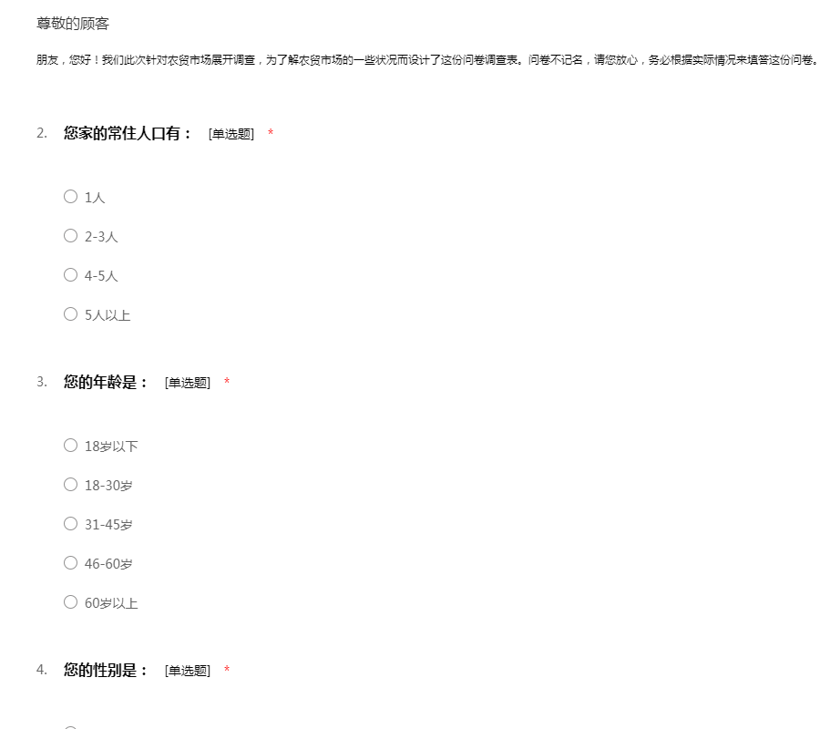 朋友,您好!我们此次针对农贸市场展开调查,为了解农贸市场的一些状况而设计了这份问卷调查表。问卷不记名,请您放心,务必根据实际情况来填答这份问卷。对于您的参与,我们深表感谢!