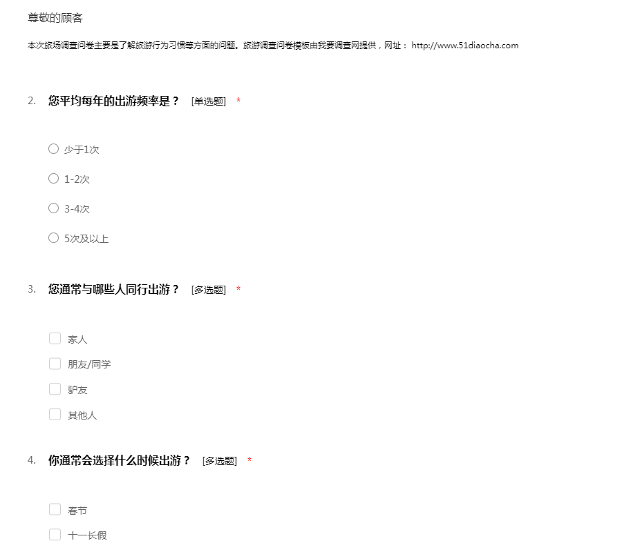 本次旅场调查问卷主要是了解旅游行为习惯等方面的问题。旅游调查问卷模板由我要调查网提供,网址: http://www.51diaocha.com