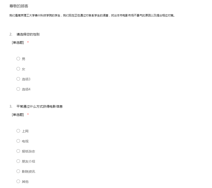 我们是南京理工大学泰州科技学院的学生,我们现在正在通过对各系学生的调查,找出本市电影市场不景气的原因以及提出相应对策。