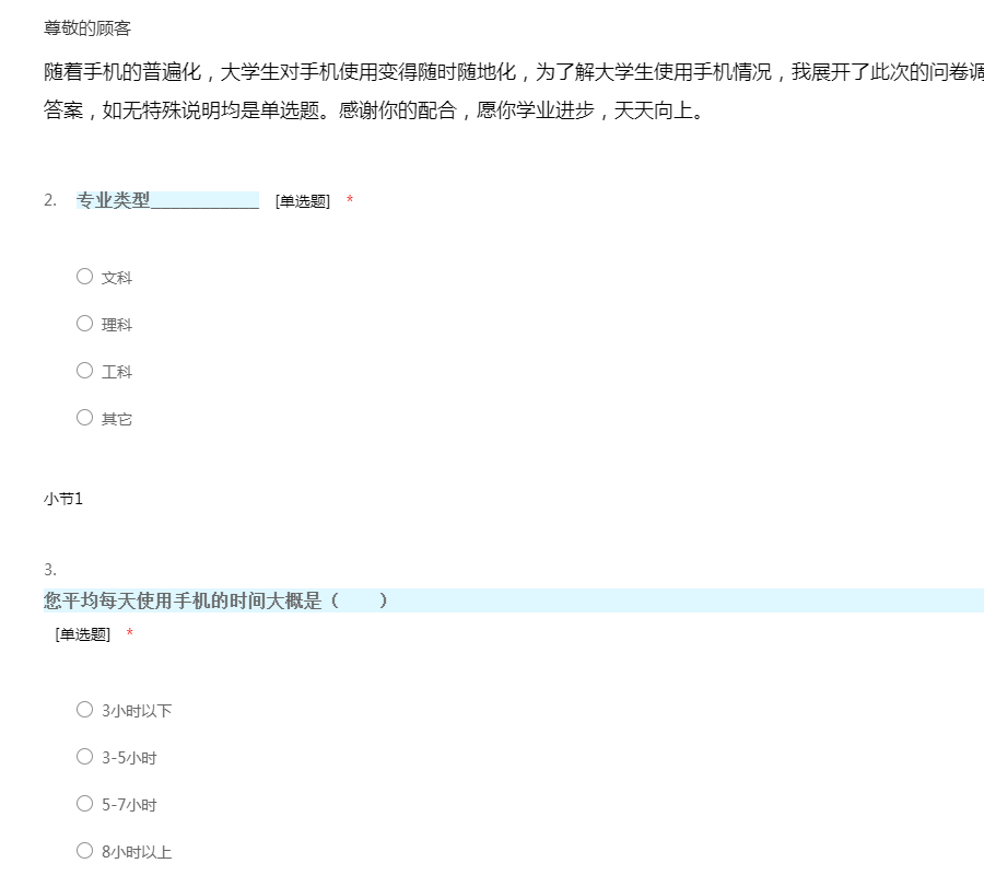 随着手机的普遍化,大学生对手机使用变得随时随地化,为了解大学生使用手机情况,我展开了此次的问卷调查。请在相应的选项中填上你的答案,如无特殊说明均是单选题。感谢你的配合,愿你学业进步,天天向上。