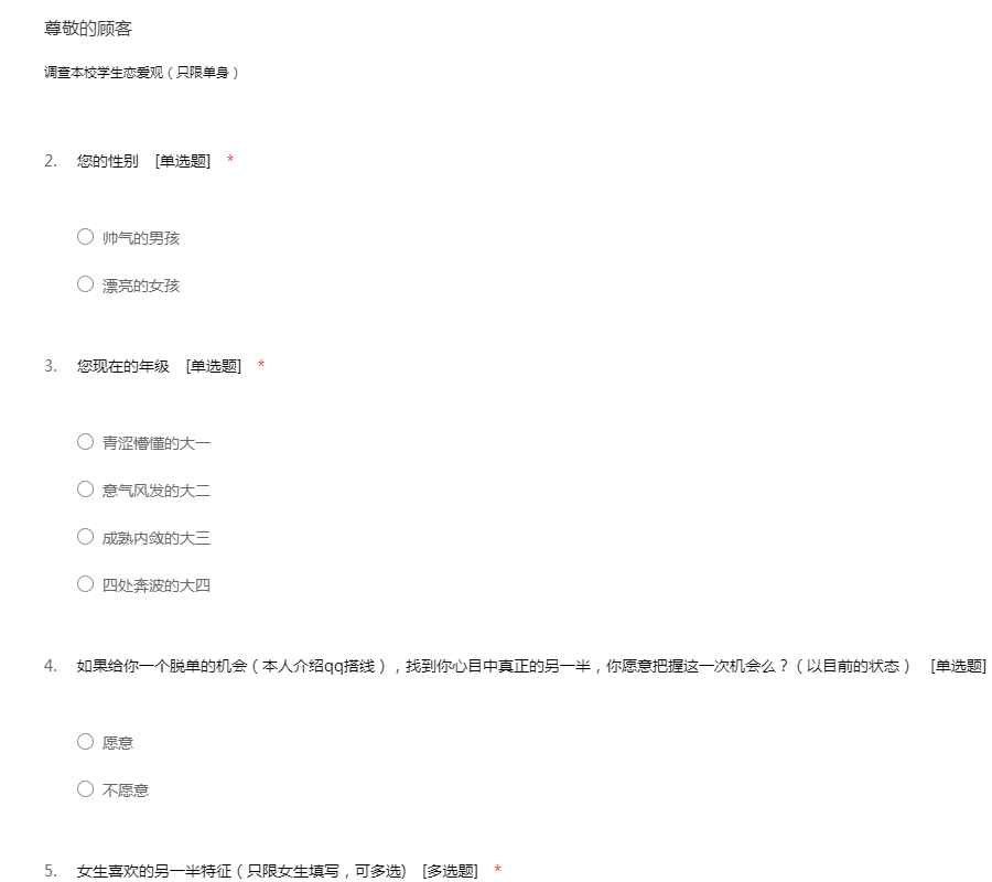 本次问卷调查意在了解当代大学生的恋爱实际情况,您的真实回答对我们来说十分宝贵!感谢您在百忙之中回答此卷!51调查网(我要调查网)谢谢您的参与。
