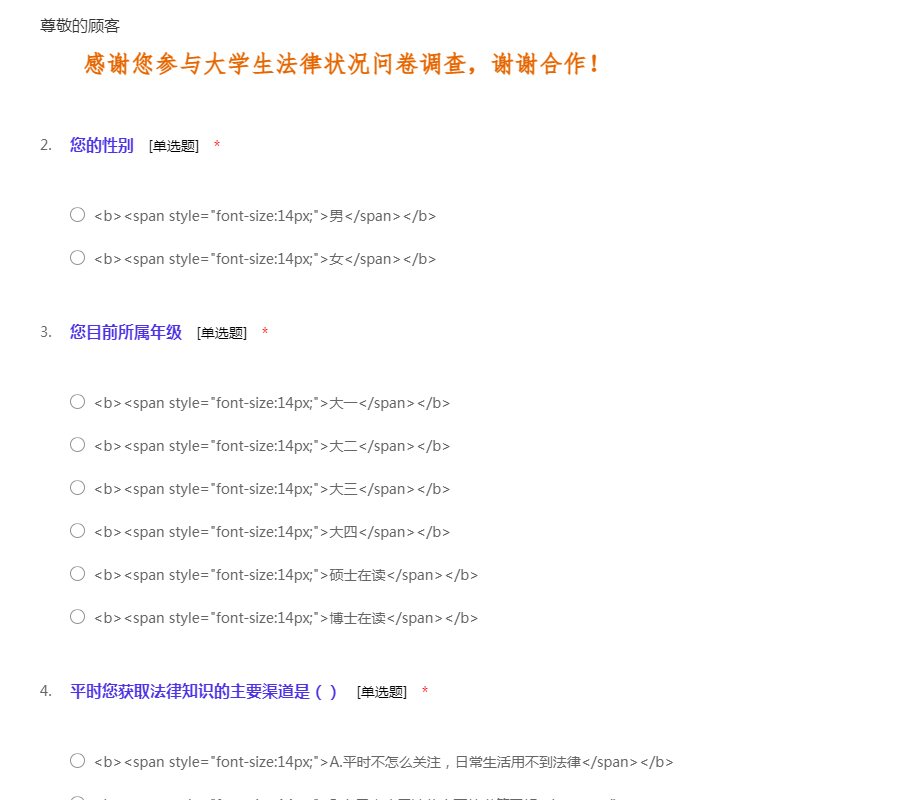 感谢您参与大学生法律状况问卷调查,谢谢合作!