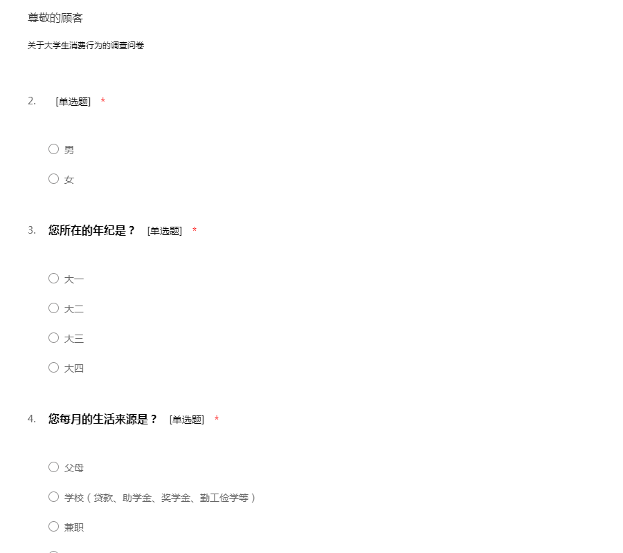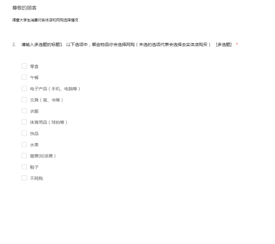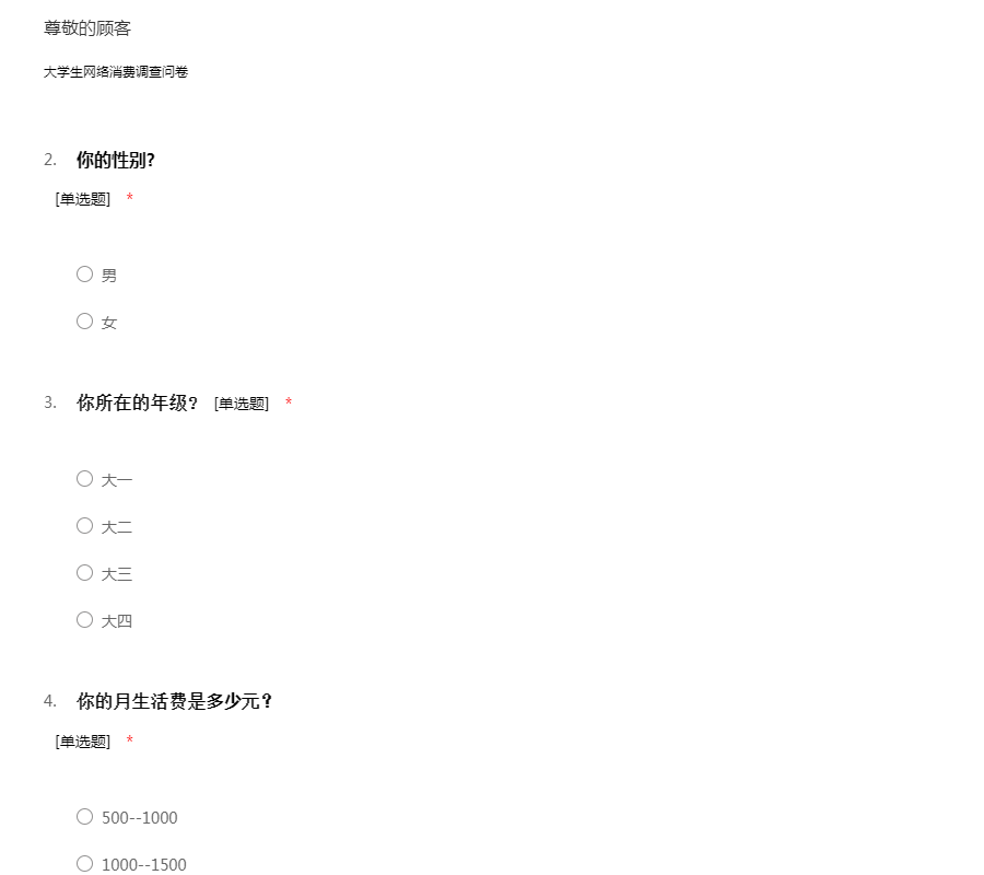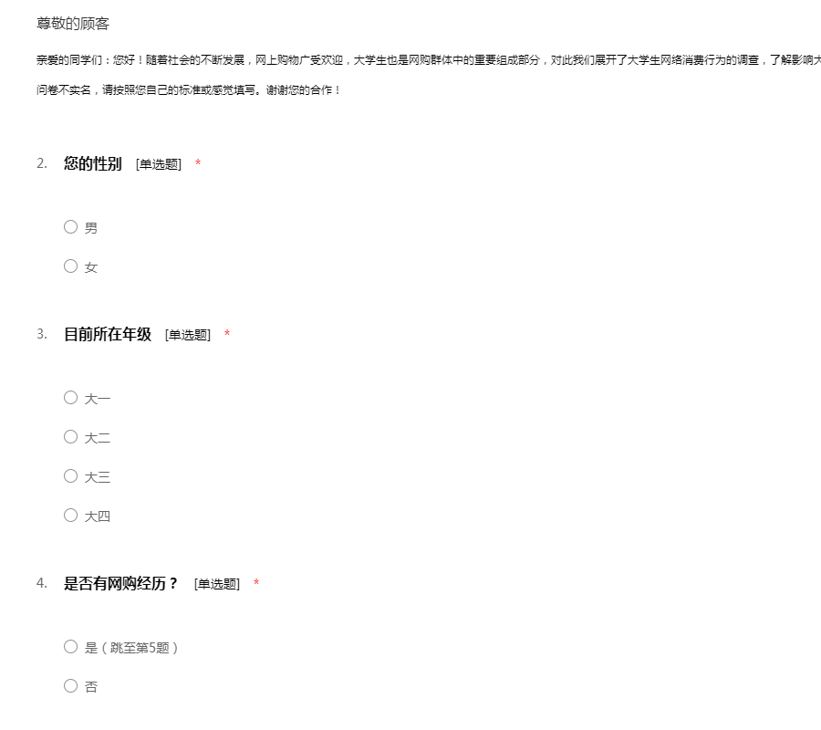 亲爱的同学们:您好!随着社会的不断发展,网上购物广受欢迎,大学生也是网购群体中的重要组成部分,对此我们展开了大学生网络消费行为的调查,了解影响大学生网购的原因、促使大学生网购的原因等。本问卷不实名,请按照您自己的标准或感觉填写。谢谢您的合作!