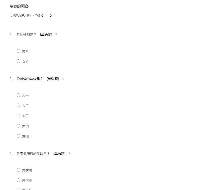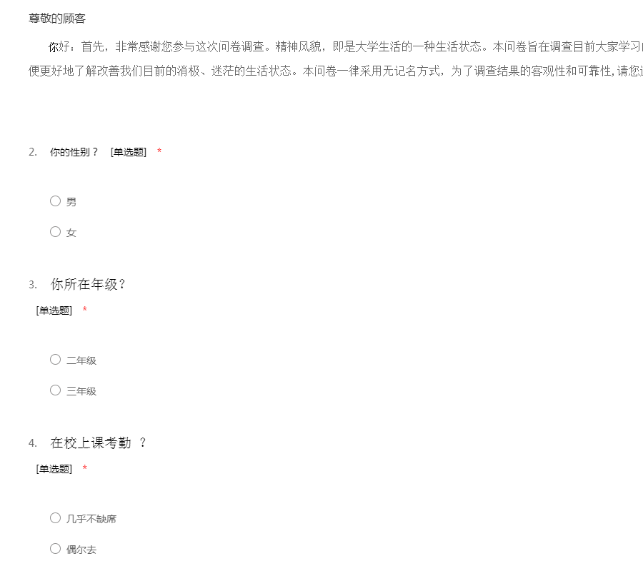 你好:首先,非常感谢您参与这次问卷调查。精神风貌,即是大学生活的一种生活状态。本问卷旨在调查目前大家学习的现状、及生活塔读存在的问题,以便更好地了解改善我们目前的消极、迷茫的生活状态。本问卷一律采用无记名方式,为了调查结果的客观性和可靠性,请您遵照事实作答,谢谢! 。