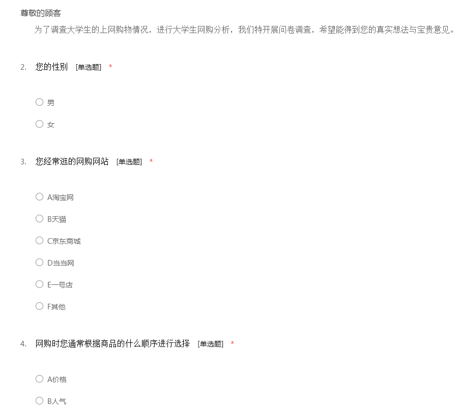 为了调查大学生的上网购物情况,进行大学生网购分析,我们特开展问卷调查,希望能得到您的真实想法与宝贵意见。谢谢您的合作!