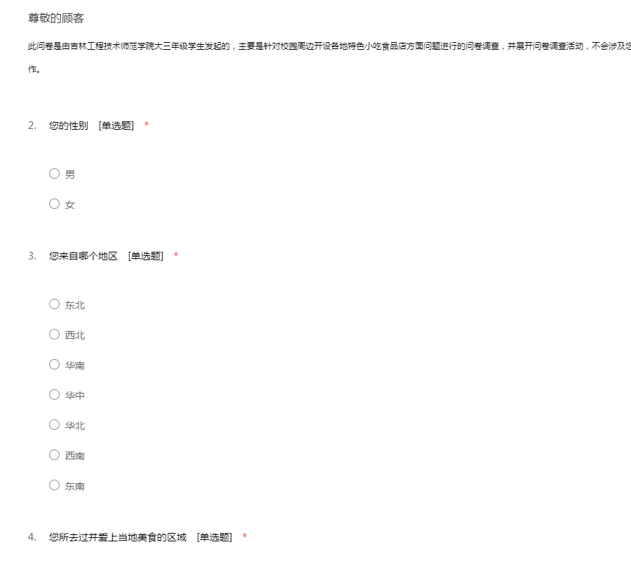 此问卷是由吉林工程技术师范学院大三年级学生发起的,主要是针对校园周边开设各地特色小吃食品店方面问题进行的问卷调查,并展开问卷调查活动,不会涉及您的隐私,耽误您一些宝贵的时间,谢谢您的合作。