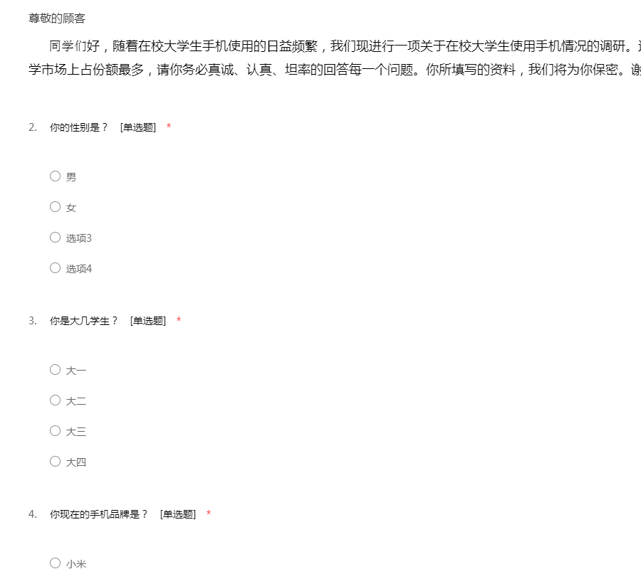 同学们好,随着在校大学生手机使用的日益频繁,我们现进行一项关于在校大学生使用手机情况的调研。通过调研了解哪种手机品牌在大学市场上占份额最多,请你务必真诚、认真、坦率的回答每一个问题。你所填写的资料,我们将为你保密。谢谢你的合作!