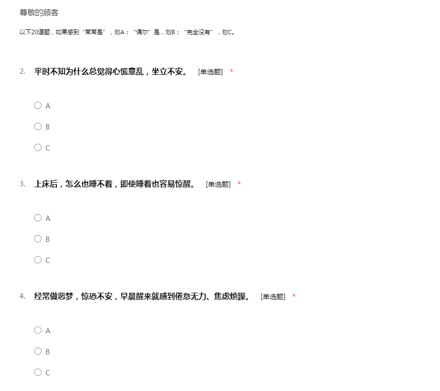 以下20道题,如果感到“常常是”,划A;“偶尔”是,划B;“完全没有”,划C。