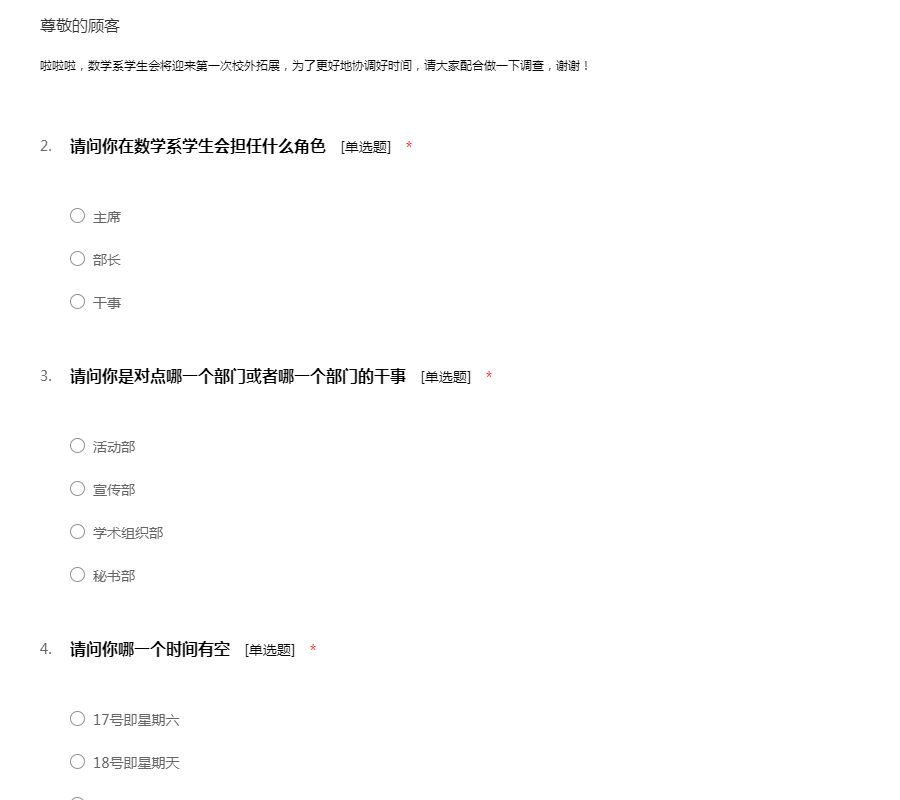 啦啦啦,数学系学生会将迎来第一次校外拓展,为了更好地协调好时间,请大家配合做一下调查,谢谢!