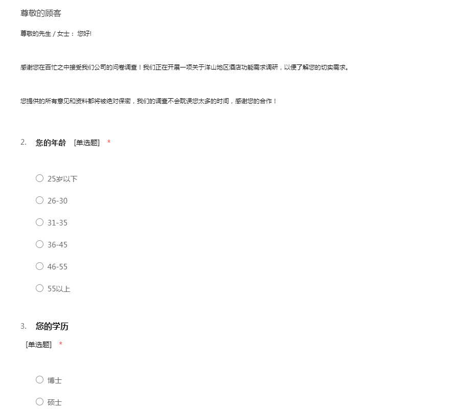 尊敬的先生/女士: 您好! 感谢您在百忙之中接受我们公司的问卷调查!我们正在开展一项关于洋山地区酒店功能需求调研,以便了解您的切实需求。您提供的所有意见和资料都将被绝对保密,我们的调查不会耽误您太多的时间,感谢您的合作!
