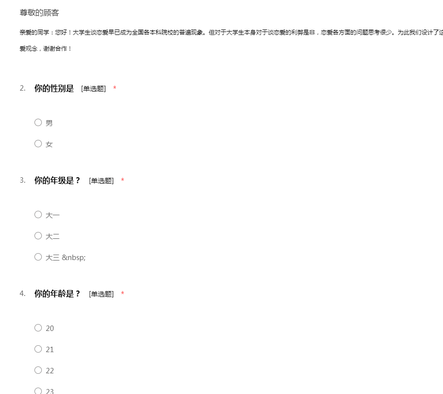 亲爱的同学:您好!大学生谈恋爱早已成为全国各本科院校的普遍现象。但对于大学生本身对于谈恋爱的利弊是非,恋爱各方面的问题思考很少。为此我们设计了这次调查研究。为同学们更清楚了解周围同学们恋爱观念,谢谢合作!
