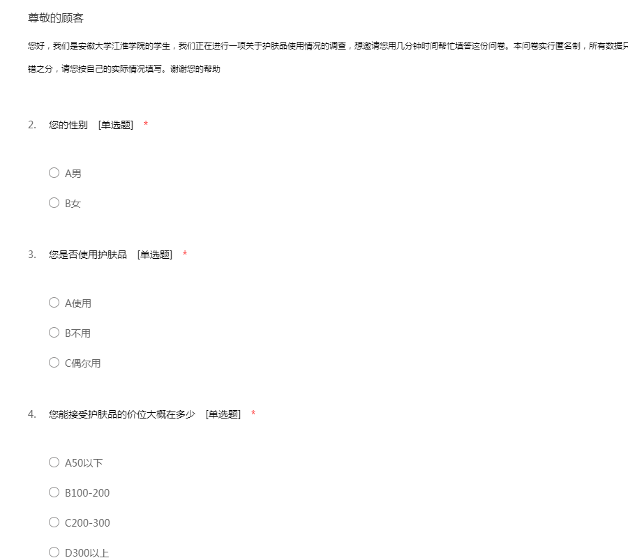 您好,我们是安徽大学江淮学院的学生,我们正在进行一项关于护肤品使用情况的调查,想邀请您用几分钟时间帮忙填答这份问卷。本问卷实行匿名制,所有数据只用于统计分析, 请您放心填写。题目选项无对错之分,请您按自己的实际情况填写。谢谢您的帮助