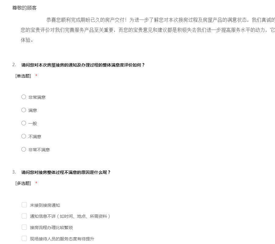 恭喜您顺利完成期盼已久的房产交付!为进一步了解您对本次接房过程及房屋产品的满意状态,我们真诚的邀请您完成下列满意度调查问卷,您的宝贵评价对我们完善服务产品至关重要,而您的宝贵意见和建议都是积极失去我们进一步提高服务水平的动力,它将帮助我们带给客户更加完美的服务体验。