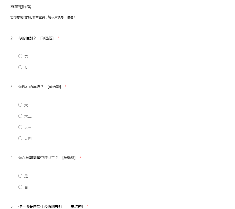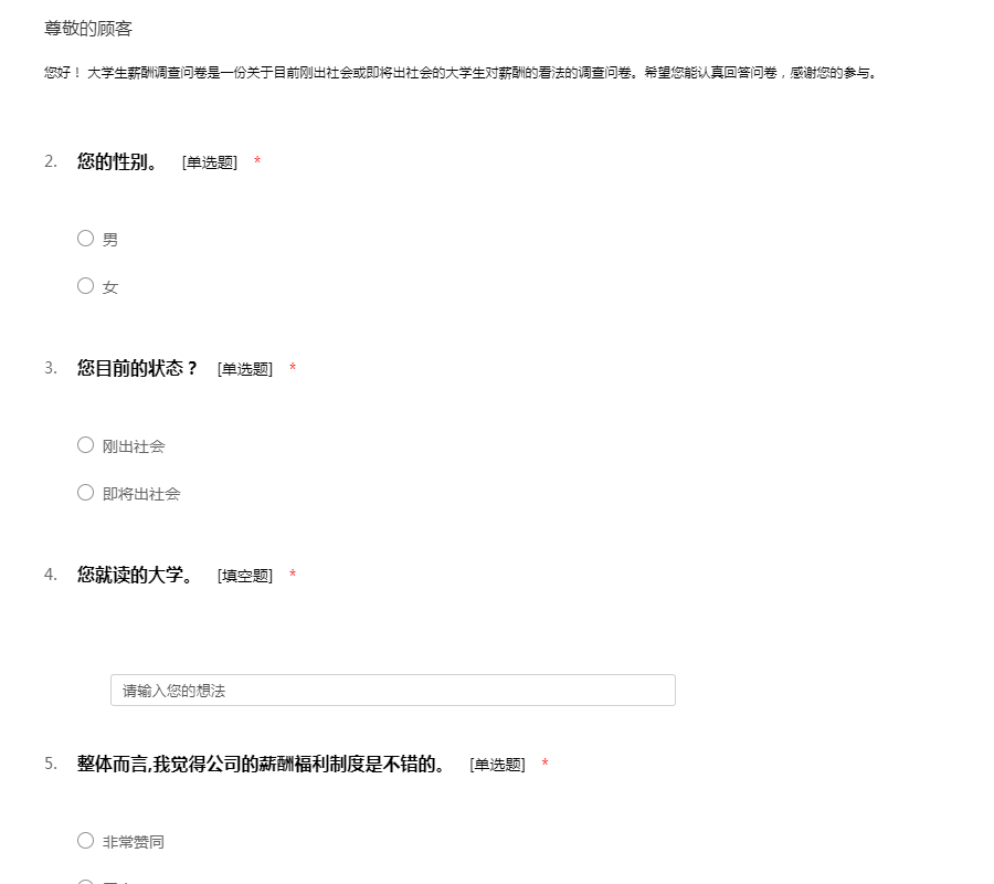 您好! 大学生薪酬调查问卷是一份关于目前刚出社会或即将出社会的大学生对薪酬的看法的调查问卷。希望您能认真回答问卷,感谢您的参与。
