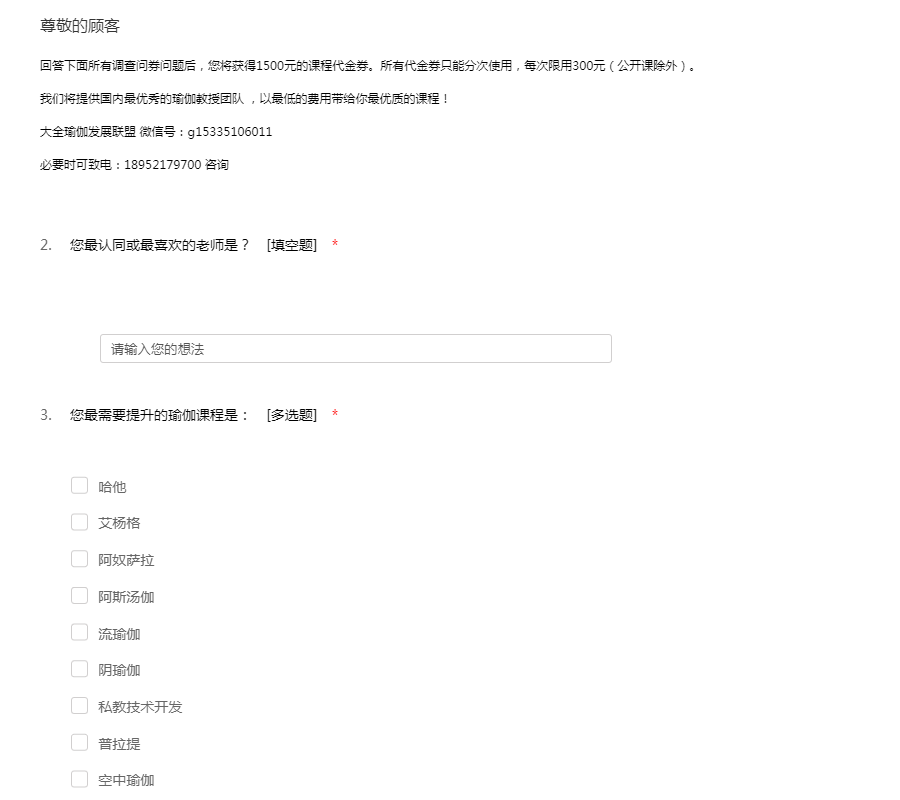 回答下面所有调查问券问题后,您将获得1500元的课程代金券。所有代金券只能分次使用,每次限用300元(公开课除外)。我们将提供国内最优秀的瑜伽教授团队 ,以最低的费用带给你最优质的课程!大全瑜伽发展联盟 微信号:g15335106011必要时可致电:18952179700 咨询