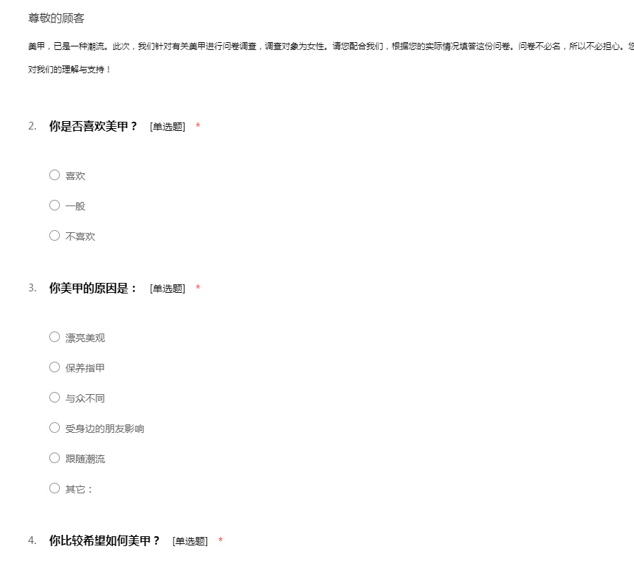 美甲,已是一种潮流。此次,我们针对有关美甲进行问卷调查,调查对象为女性。请您配合我们,根据您的实际情况填答这份问卷。问卷不必名,所以不必担心。您的回答,将对我们的调查结果相当重要。感谢您对我们的理解与支持!