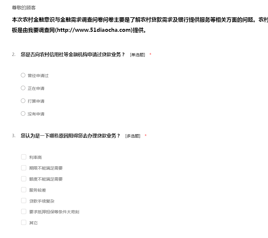 本次农村金融意识与金融需求调查问卷问卷主要是了解农村贷款需求及银行提供服务等相关方面的问题。农村金融意识与金融需求调查问卷模板是由我要调查网(http://www.51diaocha.com)提供。