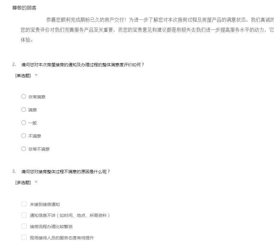 恭喜您顺利完成期盼已久的房产交付!为进一步了解您对本次接房过程及房屋产品的满意状态,我们真诚的邀请您完成下列满意度调查问卷,您的宝贵评价对我们完善服务产品至关重要,而您的宝贵意见和建议都是积极失去我们进一步提高服务水平的动力,它将帮助我们带给客户更加完美的服务体验。