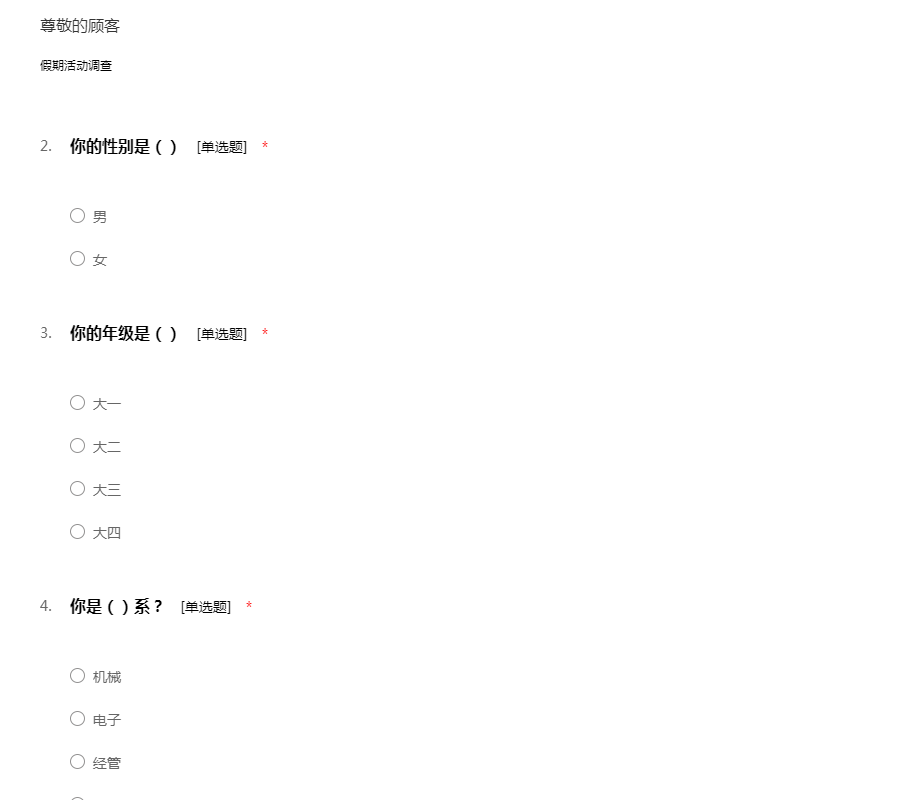 亲爱的同学,您好!在经济高速发展的今天,大学生作为一个特殊的消费群体正受到越来越大的关注。为了更好的了解当今大学生的消费状况,特做此调查活动,望您在百忙之中完成此份问卷。真诚感谢您的参与!(本次活动调查结果不用做任何商业用途,只为完成课程作业,请放心填写。)