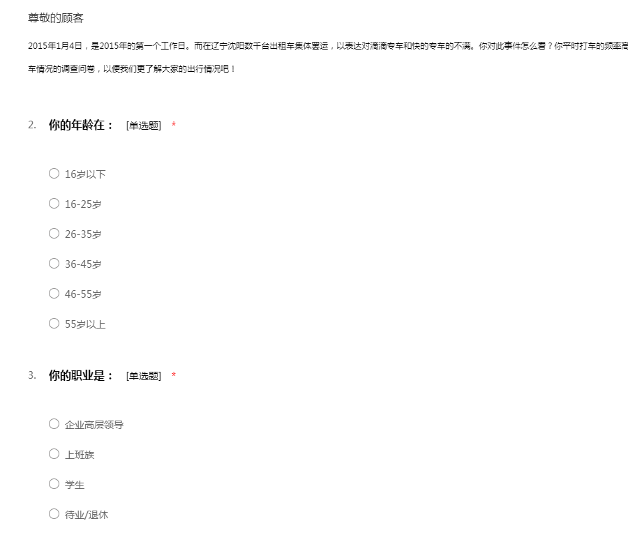 2015年1月4日,是2015年的第一个工作日。而在辽宁沈阳数千台出租车集体罢运,以表达对滴滴专车和快的专车的不满。你对此事件怎么看?你平时打车的频率高吗?你是否用过打车软件?快来填写这份有关打车情况的调查问卷,以便我们更了解大家的出行情况吧!