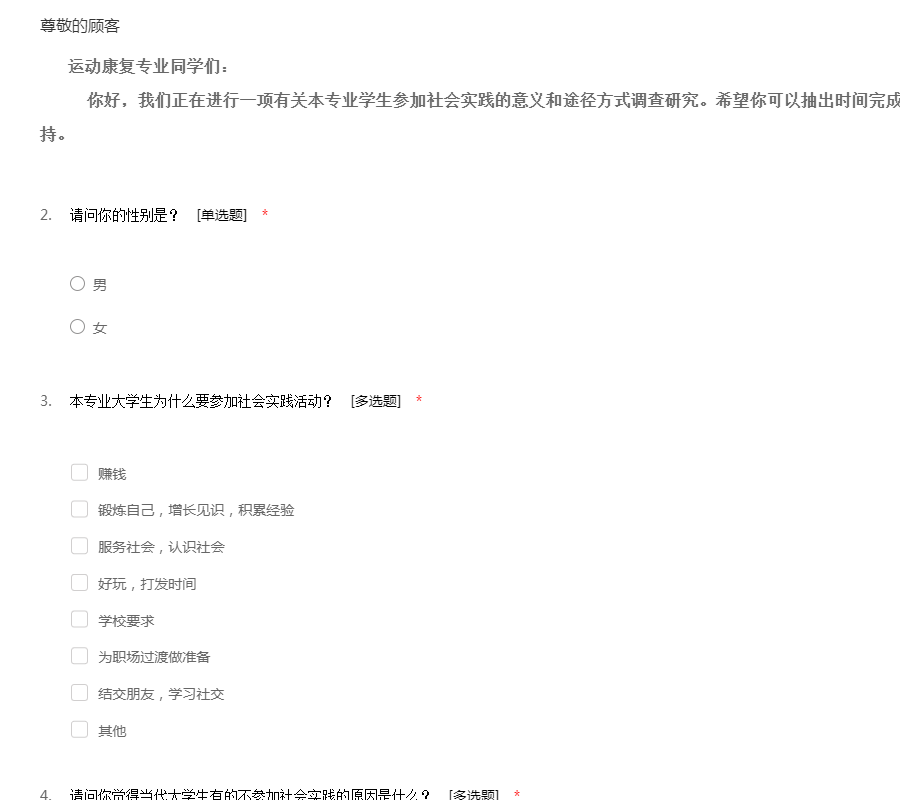 运动康复专业同学们: 你好,我们正在进行一项有关本专业学生参加社会实践的意义和途径方式调查研究。希望你可以抽出时间完成我们这份问卷,感谢你的大力支持。