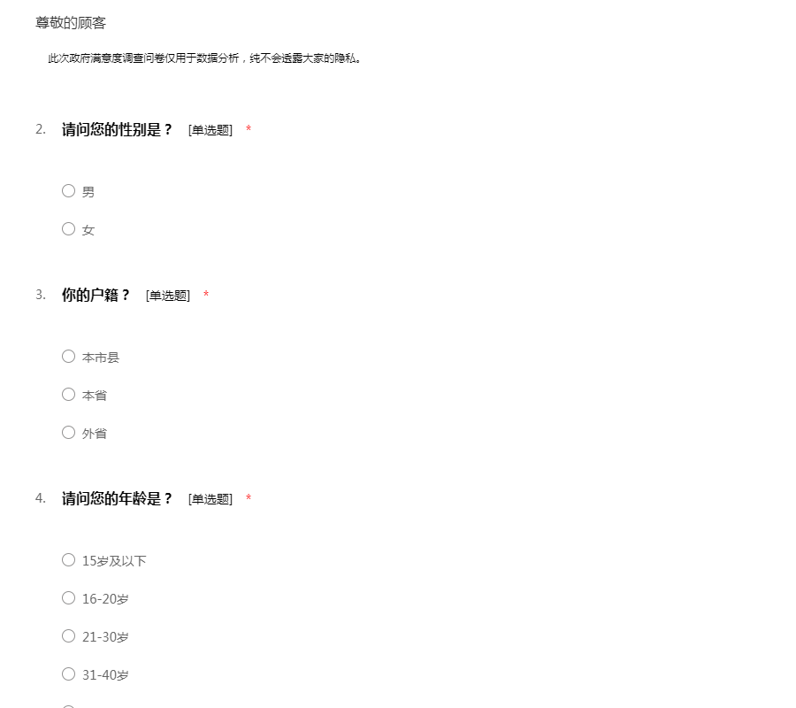 此次政府满意度调查问卷仅用于数据分析,纯不会透露大家的隐私。