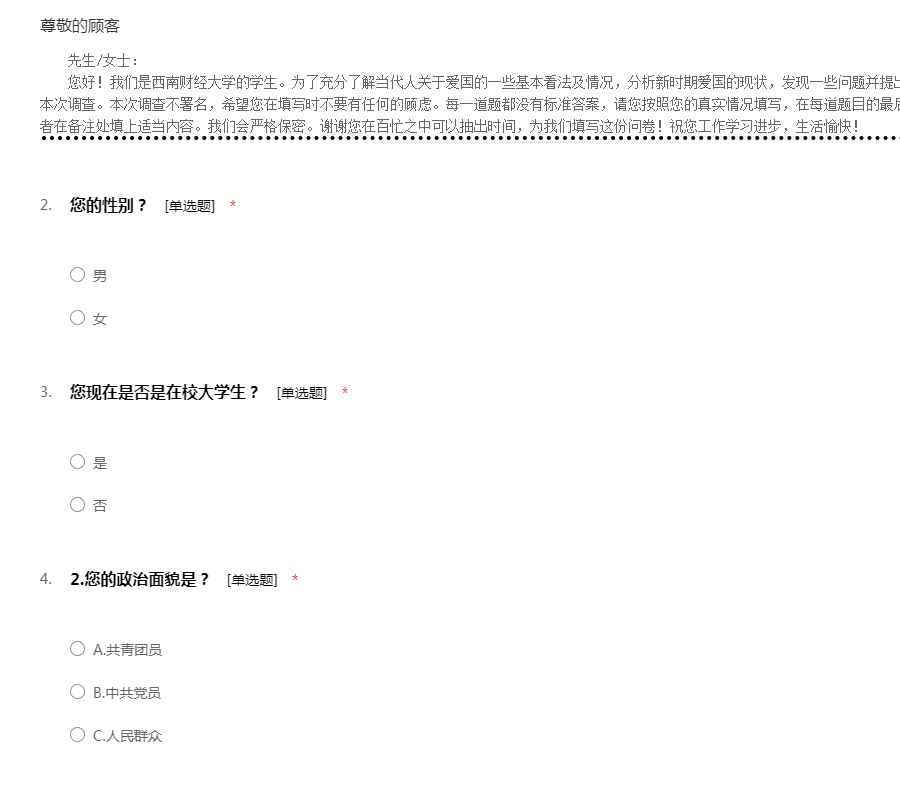 先生/女士:您好!我们是西南财经大学的学生。为了充分了解当代人关于爱国的一些基本看法及情况,分析新时期爱国的现状,发现一些问题并提出一些建议唤起大家的爱国心,特进行了本次调查。本次调查不署名,希望您在填写时不要有任何的顾虑。每一道题都没有标准答案,请您按照您的真实情况填写,在每道题目的最后填写上您认为最符合您情况的选项,或者在备注处填上适当内容。我们会严格保密。谢谢您在百忙之中可以抽出时间,为我们填写这份问卷!祝您工作学习进步,生活愉快!
