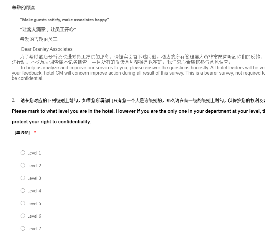 “Make guests satisfy, make associates happy” “让客人满意,让员工开心” 亲爱的吉朗丽员工 Dear Branley Associates 为了帮助酒店分析及改进对员工提供的服务,请据实回答下述问题。酒店的所有管理层人员非常愿意听到你们的反馈,总经理会依据意见调查的结果采取改进行动。本次意见调查属不记名调查,并且所有的反馈意见都将是保密的。我们衷心希望您参与意见调查。 To help us analyze and improve our services to you, please answer the questions honestly. All hotel leaders will be very interested to hear your feedback, hotel GM will concern improve action during all result of this survey. This is a bearer survey, not required to put your name, all feedback to be confidential.