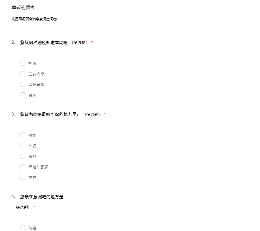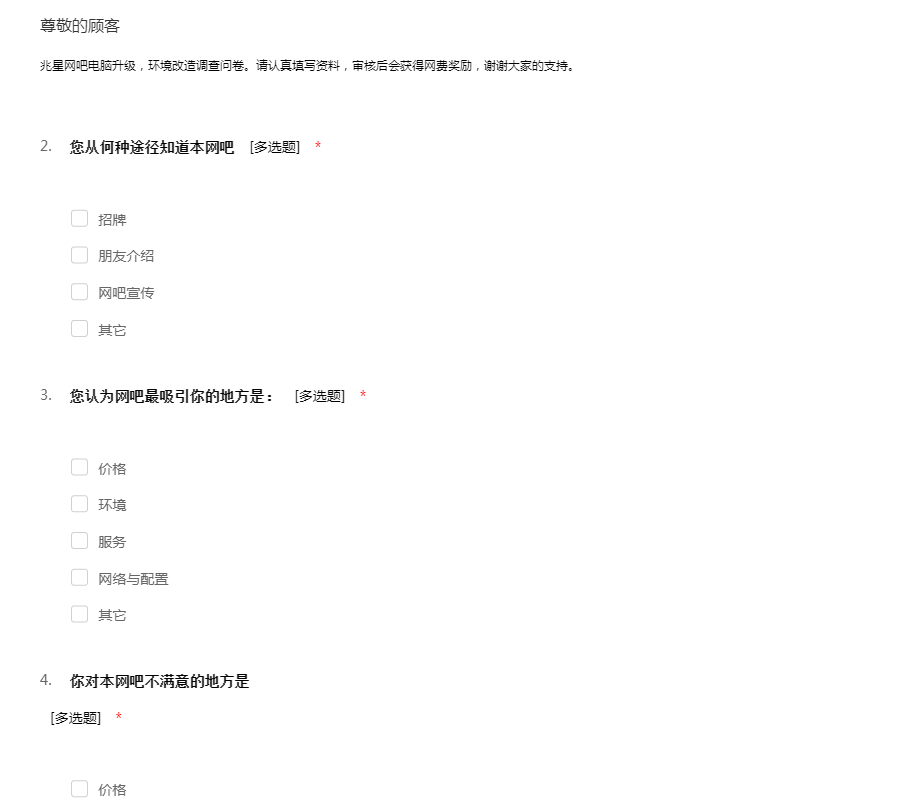 兆星网吧电脑升级,环境改造调查问卷。请认真填写资料,审核后会获得网费奖励,谢谢大家的支持。
