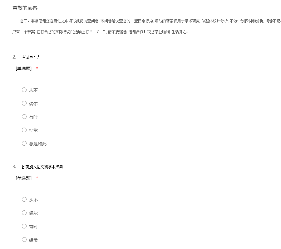 您好,非常感谢您在百忙之中填写此份调查问卷,本问卷是调查您的一些日常行为,填写的答案仅用于学术研究,做整体统计分析,不做个别探讨和分析,问卷不记名,答案无对错之分。题目共分为5个等级,每个题只有一个答案,在符合您的实际情况的选项上打“ V ”,请不要漏选,谢谢合作!祝您学业顺利,生活开心。