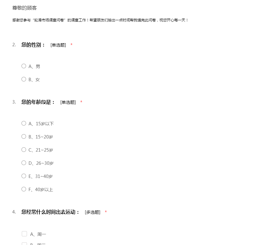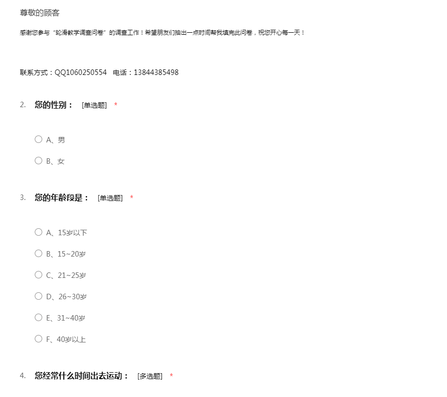感谢您参与“轮滑市场调查问卷”的调查工作!希望朋友们抽出一点时间帮我填完此问卷,祝您开心每一天!