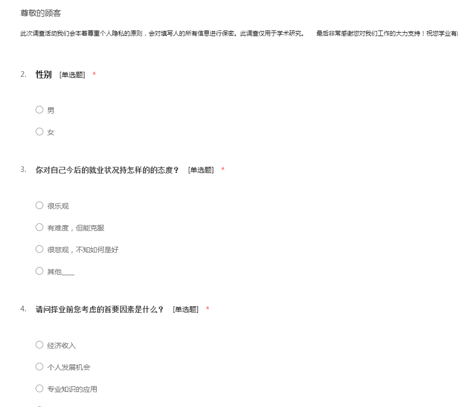 此次调查活动我们会本着尊重个人隐私的原则,会对填写人的所有信息进行保密。此调查仅用于学术研究。 最后非常感谢您对我们工作的大力支持!祝您学业有成,生活愉快。