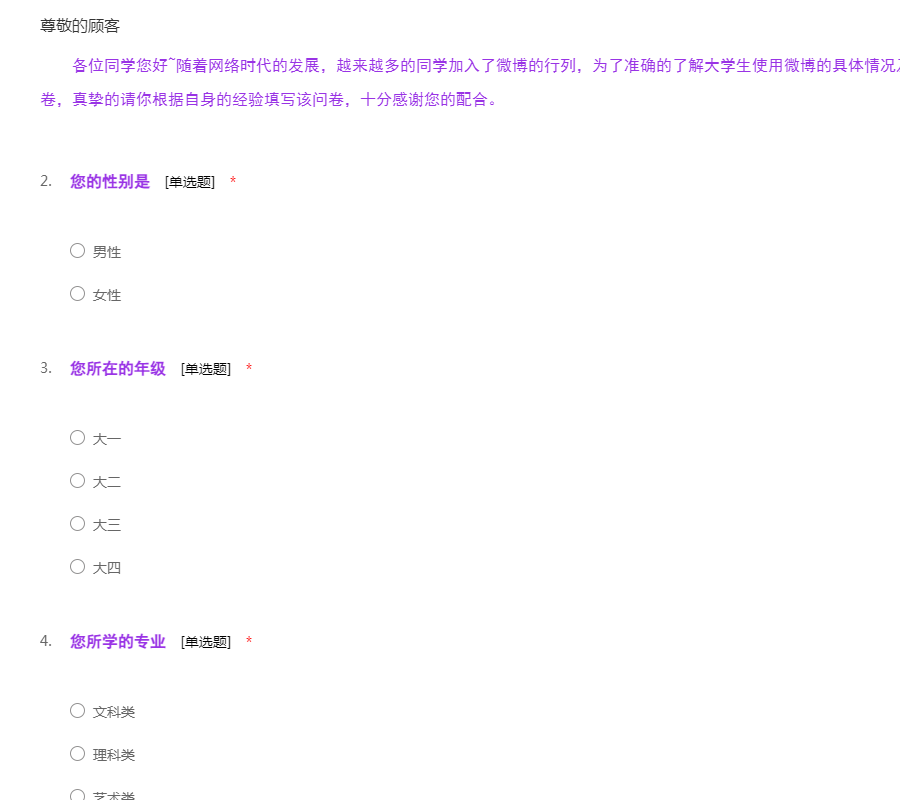 各位同学您好~随着网络时代的发展,越来越多的同学加入了微博的行列,为了准确的了解大学生使用微博的具体情况及对微博的看法,我们设计了此问卷,真挚的请你根据自身的经验填写该问卷,十分感谢您的配合。