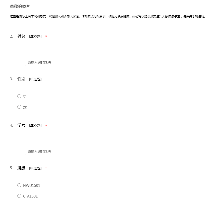 这里是国际工商学院团总支,欢迎加入这个温暖的大家庭。请如实填写报名表,核验无误后提交。我们将以短信形式通知大家面试事宜,请保持手机通畅。