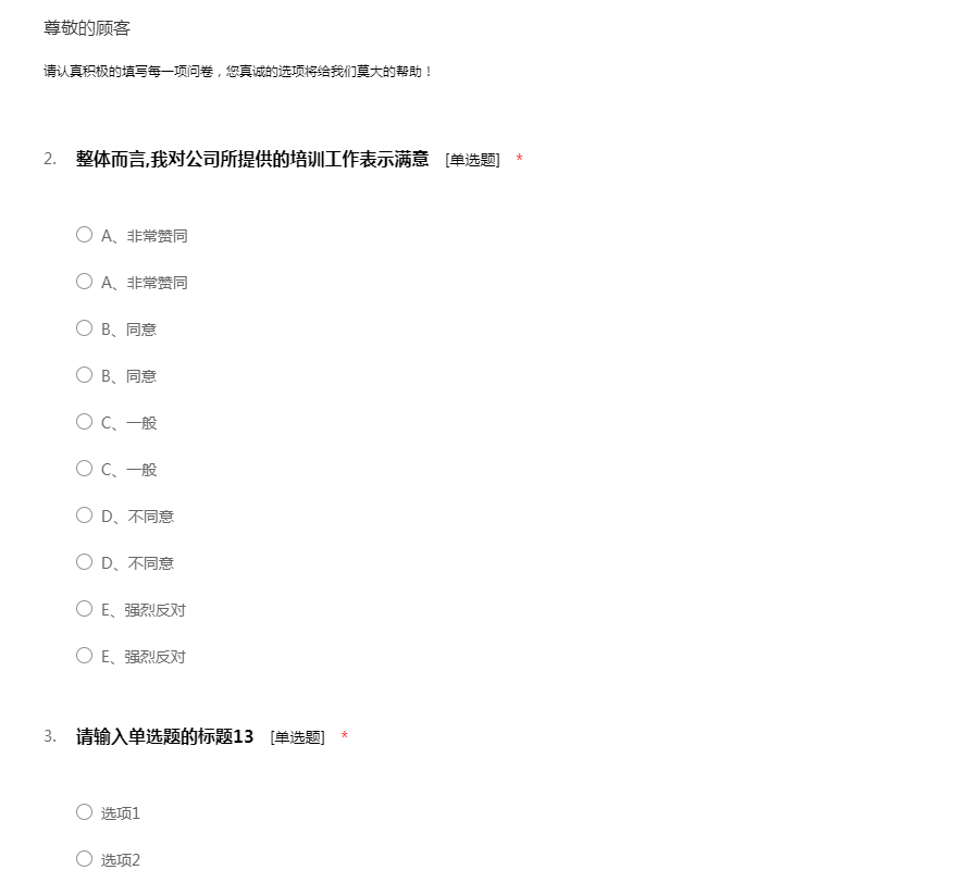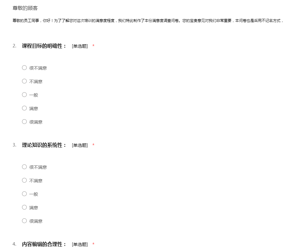尊敬的员工同事,你好!为了了解您对这次培训的满意度程度,我们特此制作了本份满意度调查问卷。您的宝贵意见对我们非常重要,本问卷也是采用不记名方式,所以请放心的如实填写。感谢您的配合!