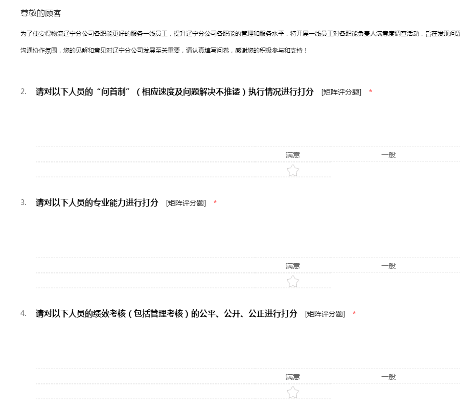 为了使安得物流辽宁分公司各职能更好的服务一线员工,提升辽宁分公司各职能的管理和服务水平,特开展一线员工对各职能负责人满意度调查活动,旨在发现问题、解决问题、营造一线员工与各职能之间良好的沟通协作氛围,您的见解和意见对辽宁分公司发展至关重要,请认真填写问卷,感谢您的积极参与和支持!