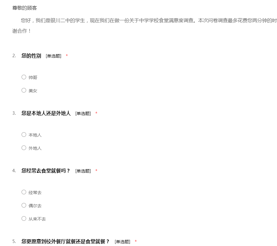 您好,我们是银川二中的学生,现在我们在做一份关于中学学校食堂满意度调查。本次问卷调查最多花费您两分钟的时间,您的回答对我们非常的重要,谢谢合作!