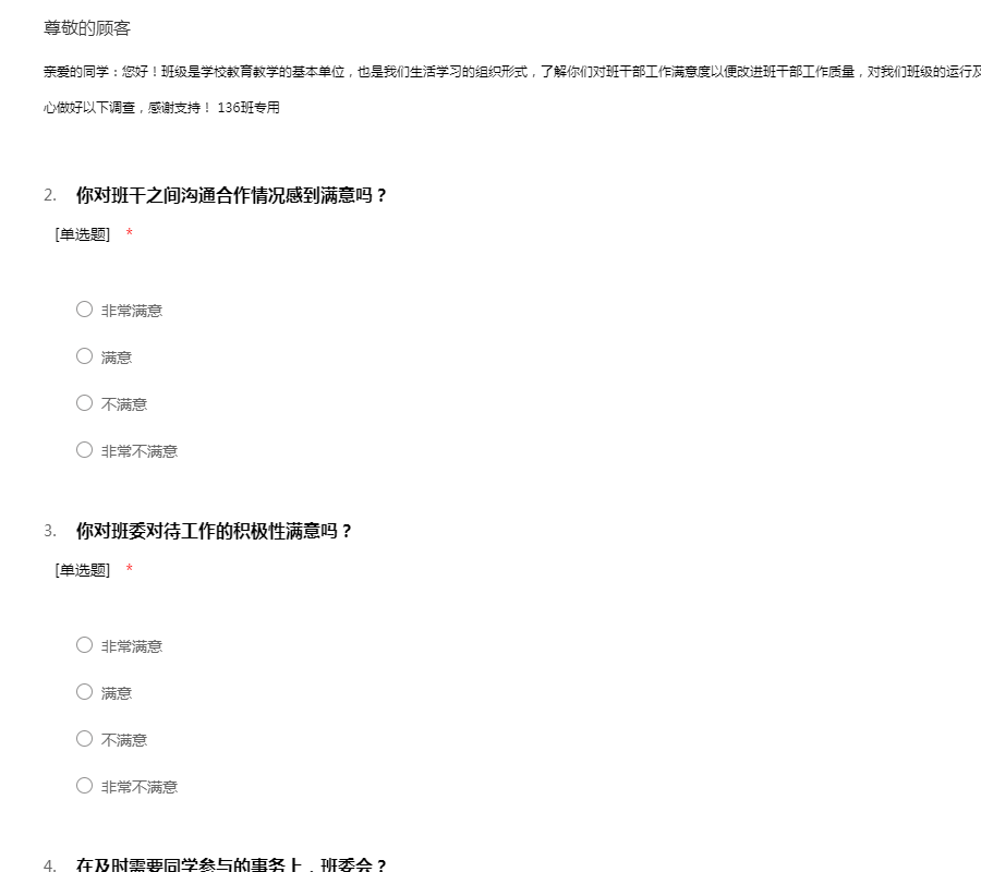 亲爱的同学:您好!班级是学校教育教学的基本单位,也是我们生活学习的组织形式,了解你们对班干部工作满意度以便改进班干部工作质量,对我们班级的运行及成员的学习生活有重要的指导意义。请同学们用心做好以下调查,感谢支持! 136班专用
