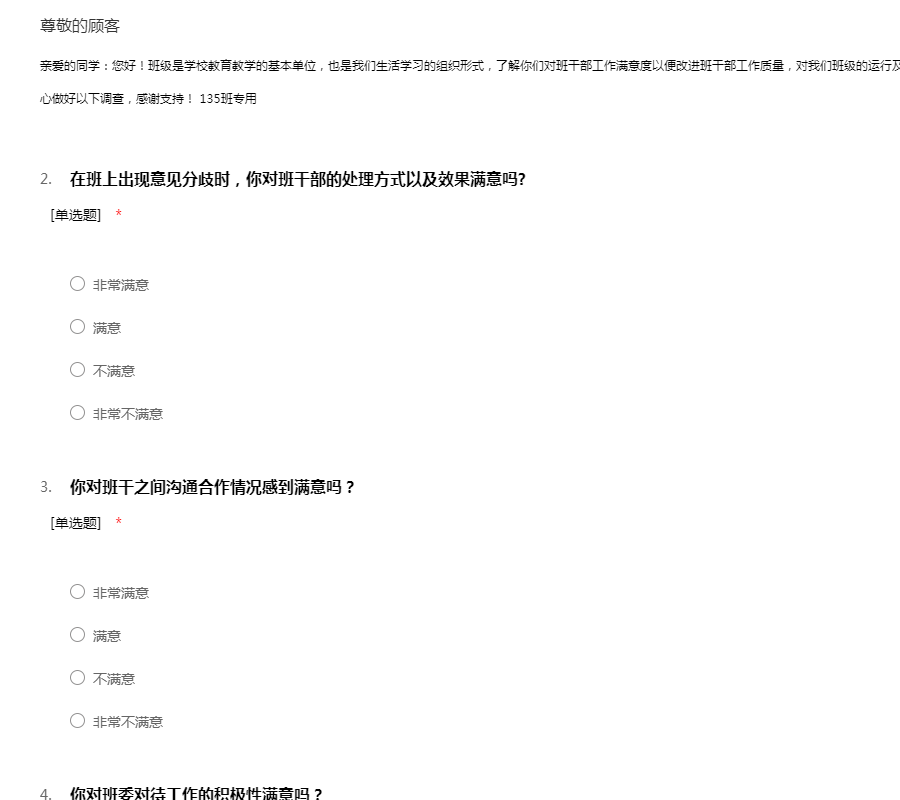 亲爱的同学:您好!班级是学校教育教学的基本单位,也是我们生活学习的组织形式,了解你们对班干部工作满意度以便改进班干部工作质量,对我们班级的运行及成员的学习生活有重要的指导意义。请同学们用心做好以下调查,感谢支持! 135班专用