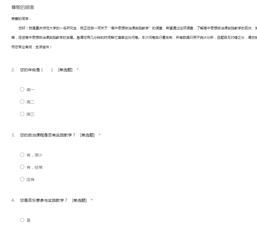亲爱的同学: 您好!我是重庆师范大学的一名研究生,我正在做一项关于“高中思想政治课实践教学”的调查,希望通过这项调查,了解高中思想政治课实践教学的现状、发现其存在的问题,以便于分析原因及寻找解决策略,促进高中思想政治课实践教学的发展。恳请您用几分钟的时间帮忙填答这份问卷。本次问卷实行匿名制,所有数据只用于统计分析,且题目无对错之分,请您按自己的实际情况放心填写。十分感谢您的帮助,祝您学业有成,生活愉快!