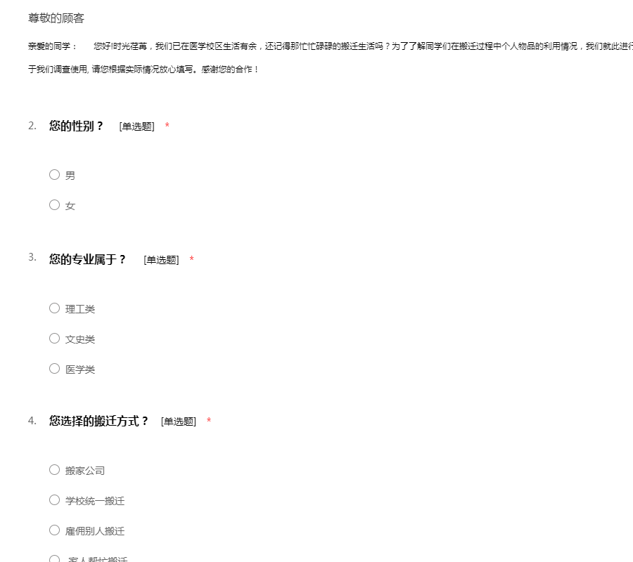 亲爱的同学: 您好!时光荏苒,我们已在医学校区生活有余,还记得那忙忙碌碌的搬迁生活吗?为了了解同学们在搬迁过程中个人物品的利用情况,我们就此进行一次调查。本问卷采用匿名形式,所有数据仅供于我们调查使用, 请您根据实际情况放心填写。感谢您的合作!