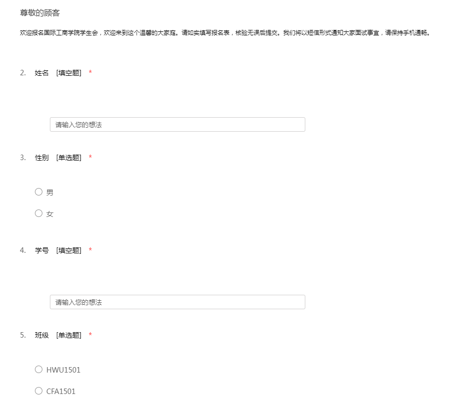 欢迎报名国际工商学院学生会,欢迎来到这个温馨的大家庭。请如实填写报名表,核验无误后提交。我们将以短信形式通知大家面试事宜,请保持手机通畅。