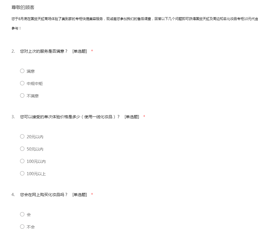 您于8月底在国贸天虹商场体验了美到家的专柜快捷美容服务,现诚邀您参加我们的售后调查,回答以下几个问题即可获得国贸天虹及周边知名化妆品专柜10元代金券一张(请提交问卷后找小编索取),感谢您的参与!
